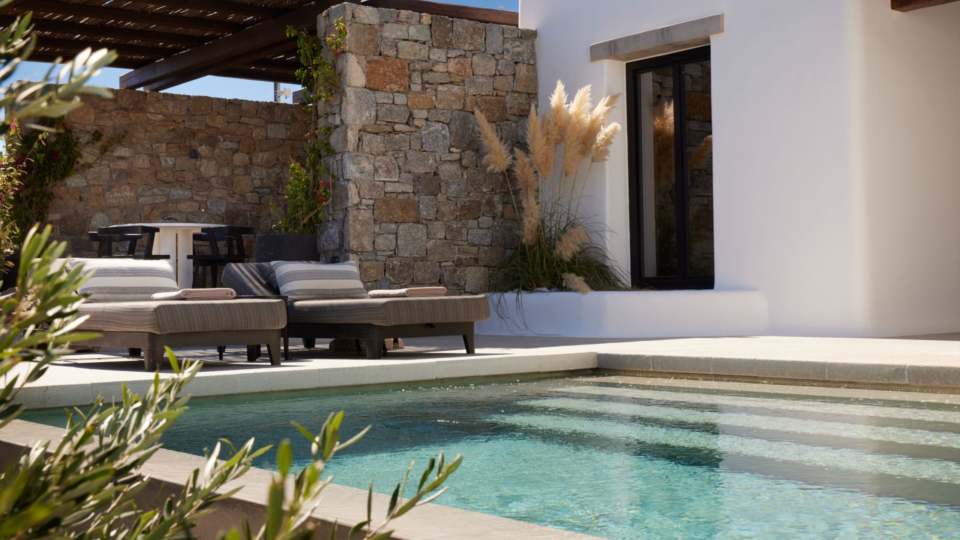 The private terrace becomes an extension of the suite itself. A heated plunge pool faces uninterrupted sea views, while shaded lounges allow for quiet moments between sun and horizon.